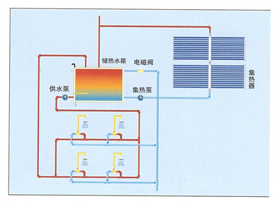 本系統(tǒng)中集熱器集中放置,設置滿足用戶需求容量的大型儲熱水箱,控制系統(tǒng)、循環(huán)裝置及其他輔助設...